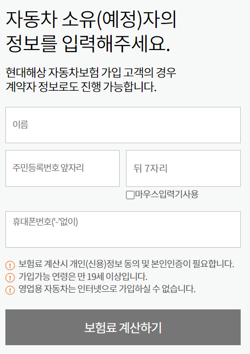 보험료 조회방법은 우선 이름, 주민번호, 휴대폰번호 입력 후 보험료 계산하기를 클릭합니다.