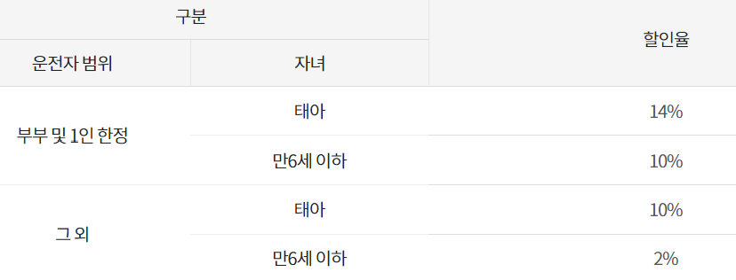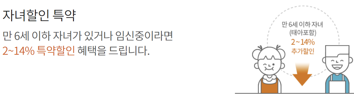 - 만 6세 이하 자녀가 있거나 임신중이라면 특약할인 혜택을 드립니다.