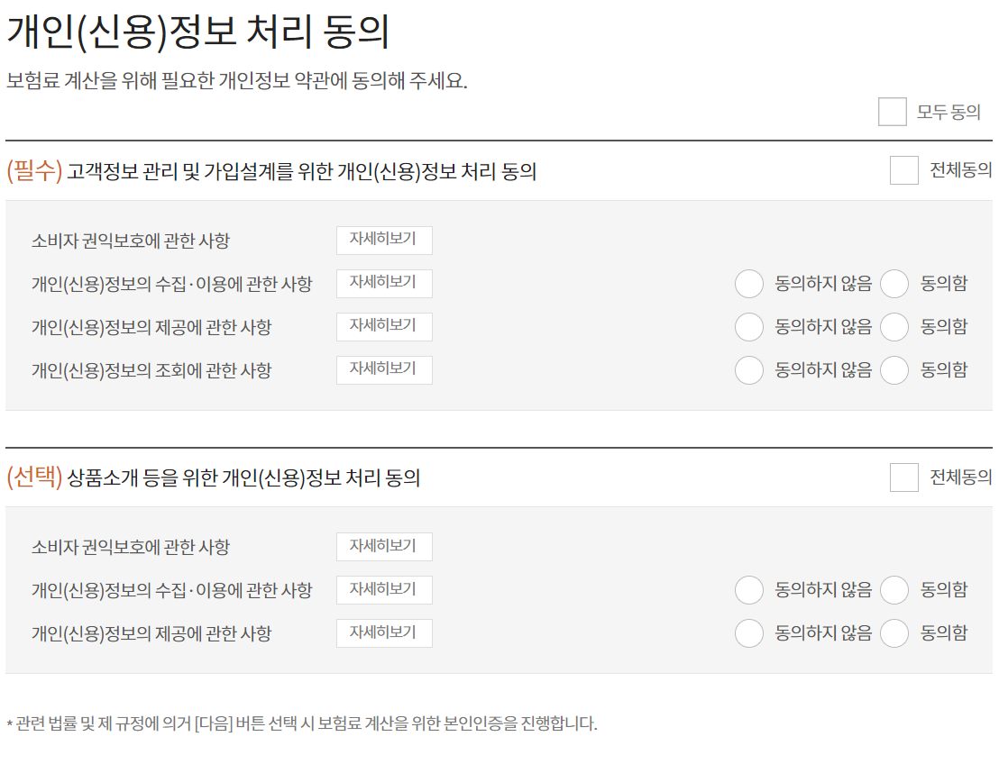 보험료 조회를 위한 개인정보 동의를 체크하시고 상품소개는 선택 동의라서 동의하지 않으셔도 됩니다.