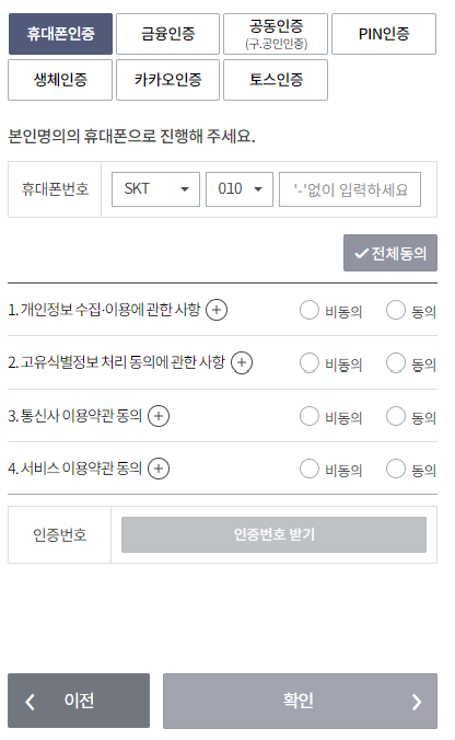 원하는 본인인증 방법을 통해 본인인증을 합니다.