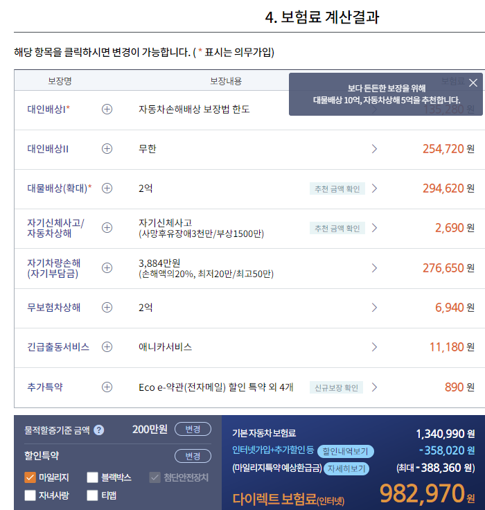 보험료는 사람마다, 보장 금액 , 할인특약 적용 등 여러 조건에 따라 달라지므로 직접 조회해보시는 것이 가장 좋습니다.
