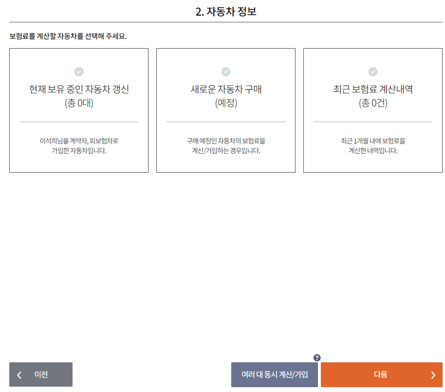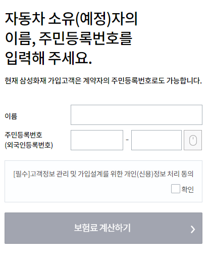 보험료 조회방법은 간단합니다. 먼저 이름, 주민번호 입력 후 보험료 계산을 위한 개인 신용 정보 처리에 동의 체크 후 보험료 계산하기를 클릭합니다.