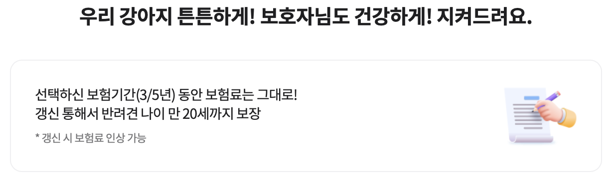 - 보장내용: 보장내용을 선택할 때 반려견의 건강상태, 라이프스타일 등을 고려하여 선택하시기 바랍니다.