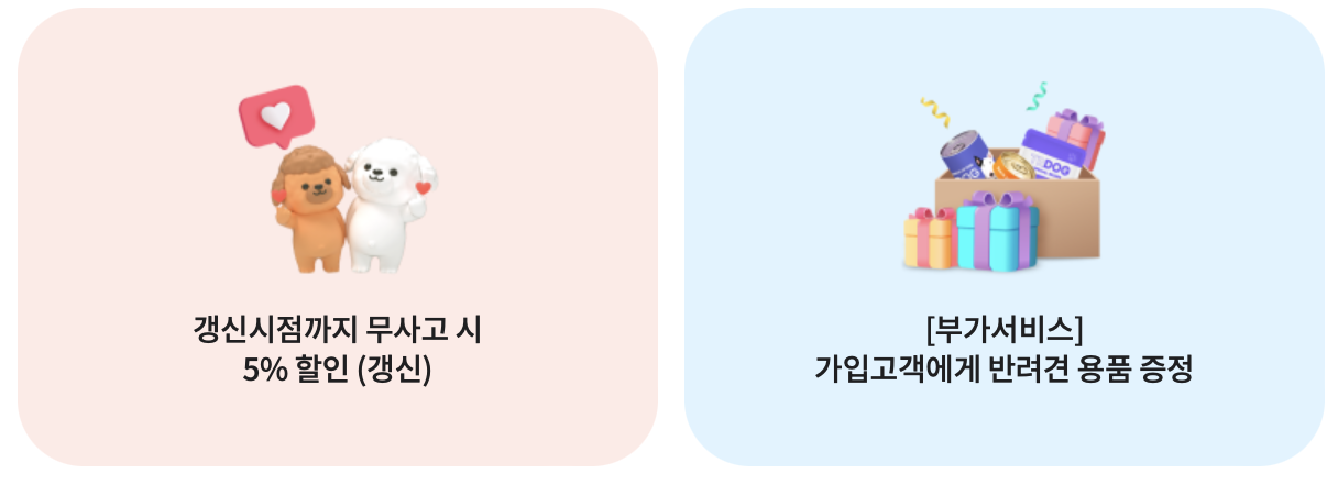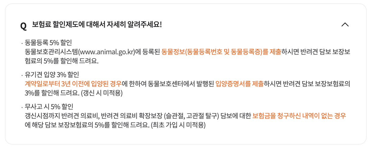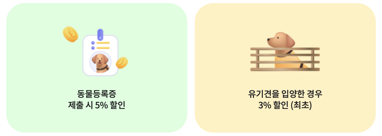 - 유기견 입양 3% 할인: 동물보호센터로 지정된 곳에서 계약일로부터 3년 이전에 입양된 경우 (최초 계약 시)