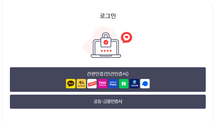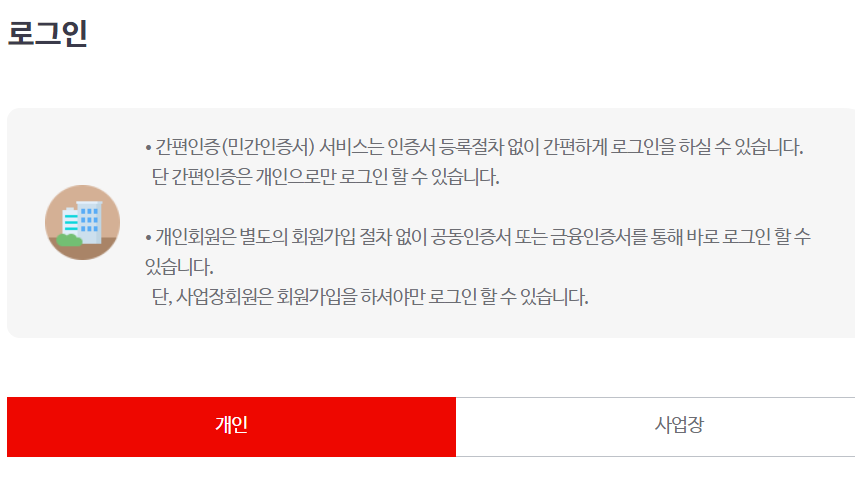 자격득실 확인서 발급을 누르면 개인과 사업장을 선택하여 로그인을 하시면 되는데 로그인 방법은 아주 다양하고 쉽습니다.