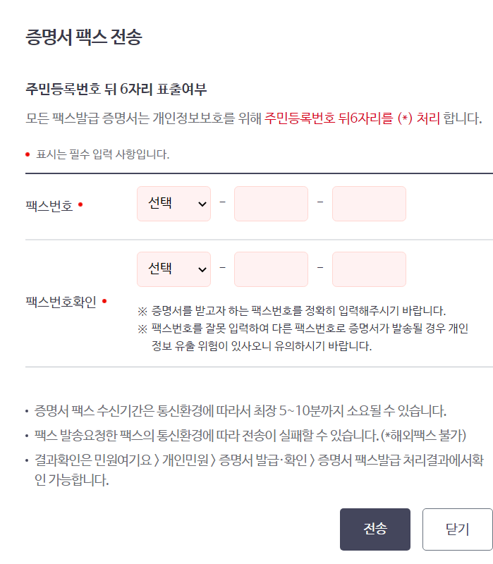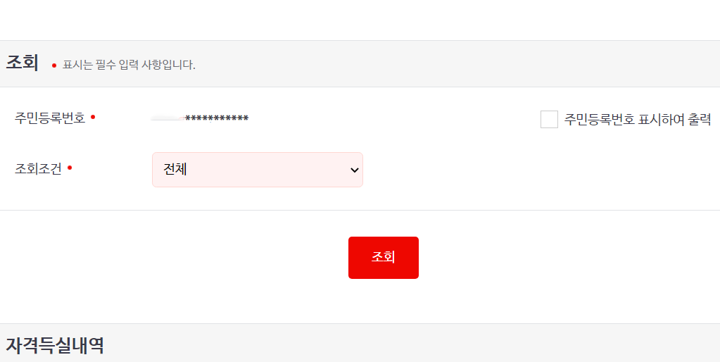 자격득실 내역이 쭉 나오고 원하는 자격득실 내역을 선택하여 프린트로 발급하거나 팩스 전송을 하시면 됩니다.