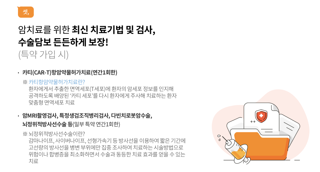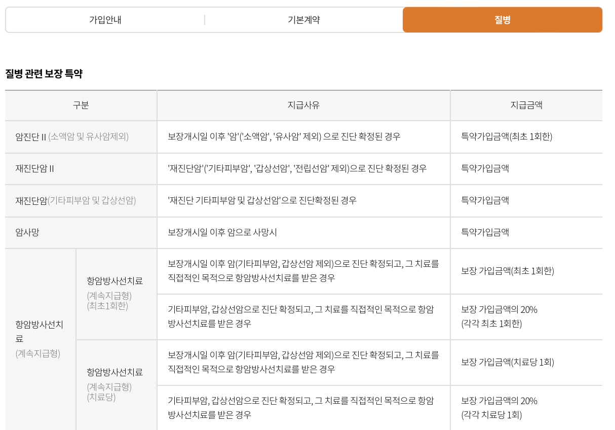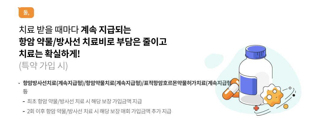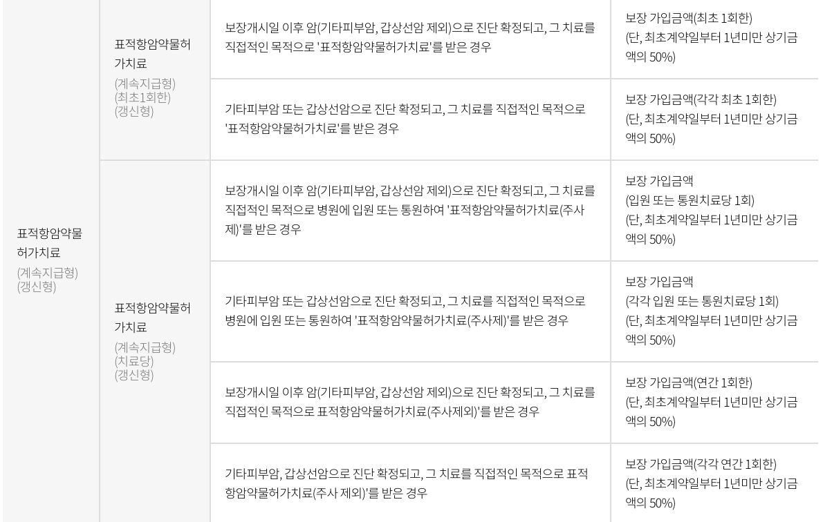 - 암 수술비, 암 입원비, 암 통원치료비, 항암치료비, 방사선치료비, 면역치료비는 1년간 보장됩니다.