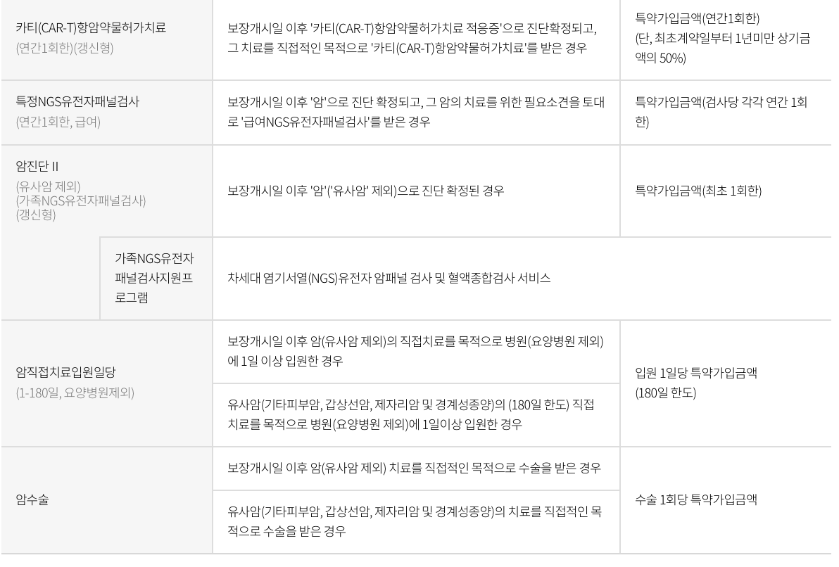 - 고액암 보장: 10대 암, 20대 암, 30대 암, 40대 암, 50대 암, 60대 암, 70대 암, 80대 암 등 8개 등급으로 나누어 고액암에 대한 보장을 제공합니다.