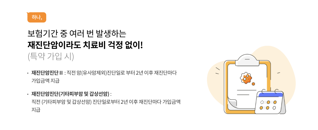 - 재진단 보장: 암으로 진단받은 후 5년 이내에 재발 또는 전이된 경우, 최초 진단 시 보험금을 다시 지급합니다.